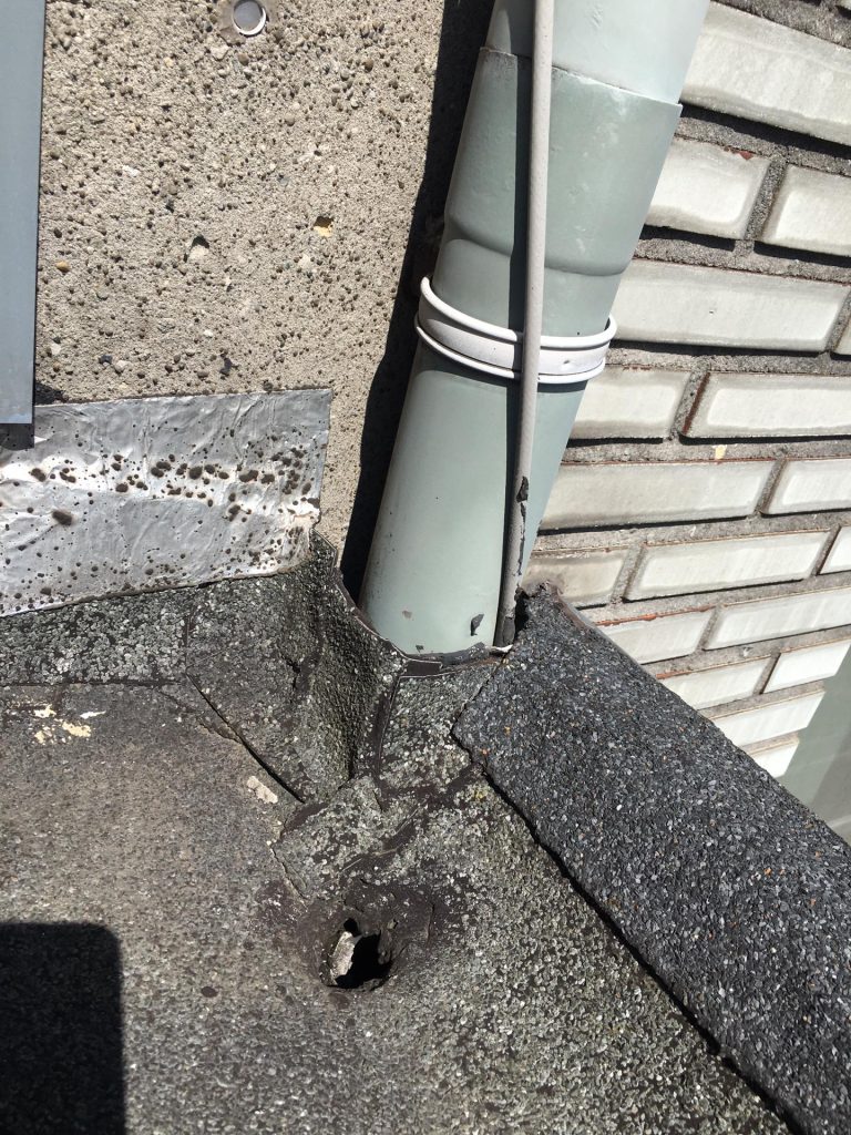 And there it is. The zinc gutter. Neglected, patched — a few flaps of roofing felt torched