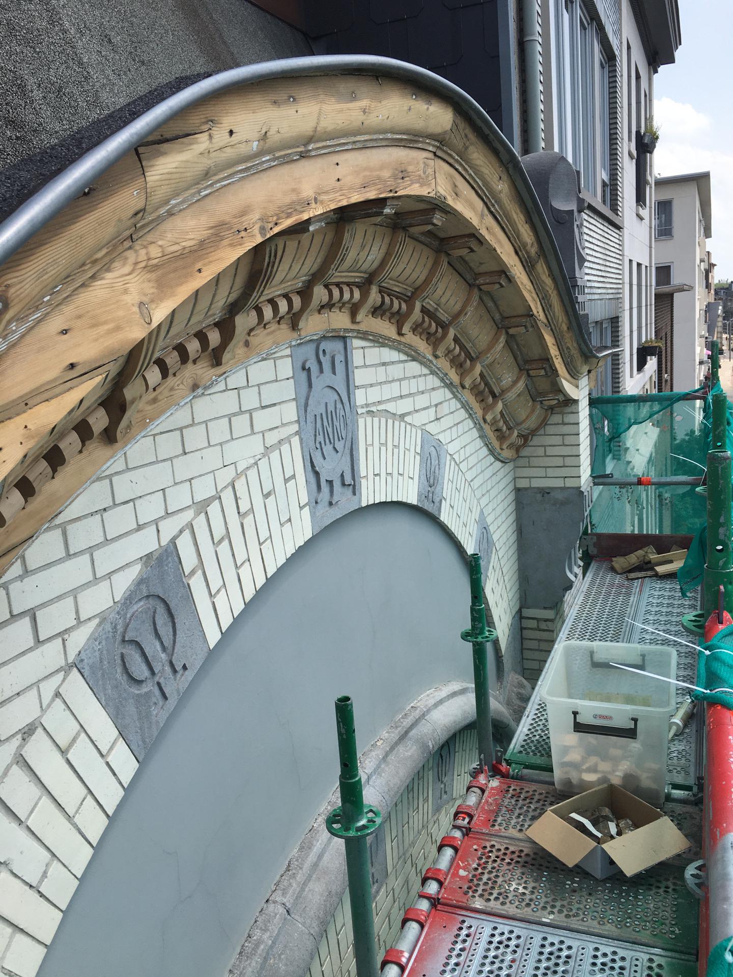 Belgian blue stone is a defining element in many historic facades, used for plinths, window sills, door thresholds, corniches and decorative details. Its durability and refined appearance make it both structural and expressive. Restoration focuses on carefull cleaning, local repairs and consolidation rather than replacement. Damaged or weathered areas are treated with compatible mineral products, preserving original tool marks and surface texture. When replacement is unavoidable, matching stone is selected to maintain visual continuity and architetural integrity.